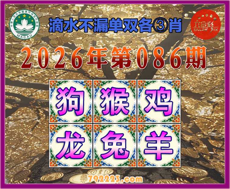 086期: 滴水不漏 🧩单双各③肖🧩【狗.猴.鸡.龙.兔.】开:羊12
