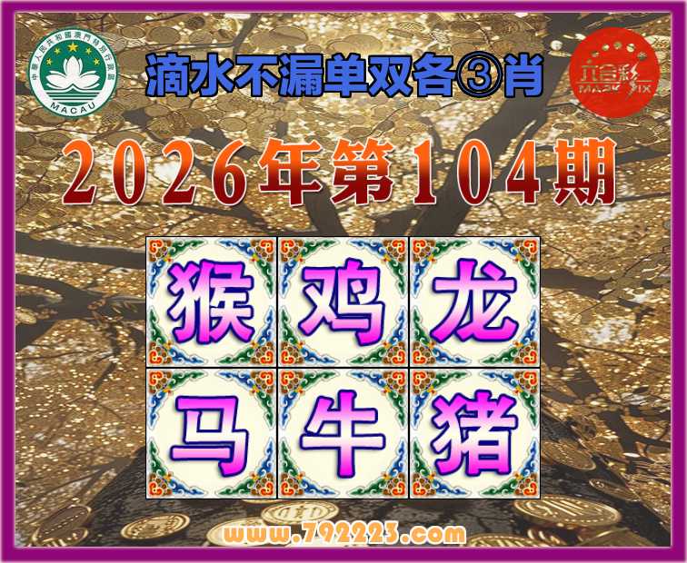 104期: 滴水不漏 🧩单双各③肖🧩【猴.鸡.龙..牛.猪】开:马01